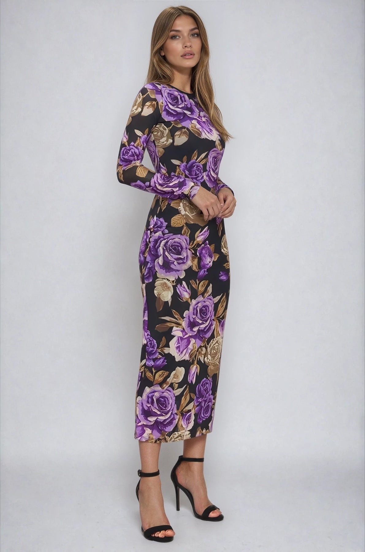 Floral power mesh midi dress with a body-contouring silhouette