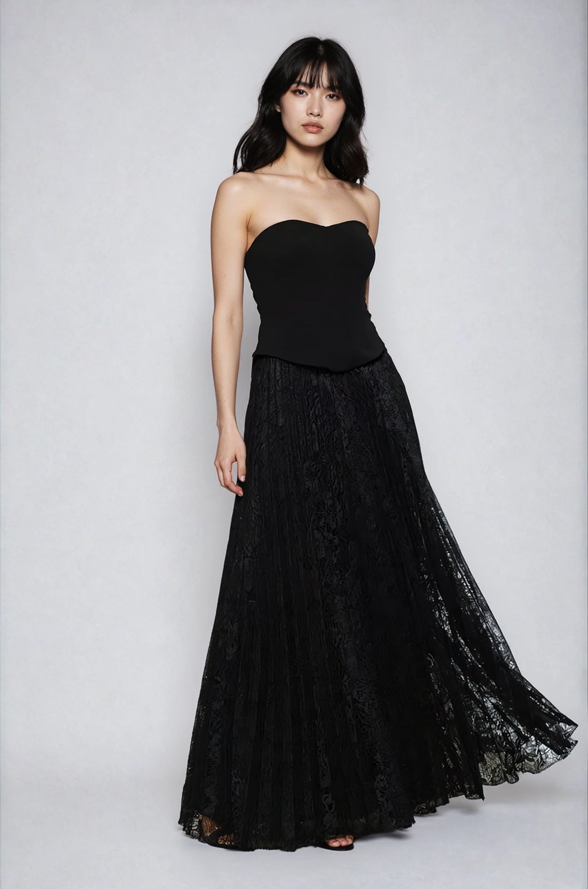 • Flowing pleated lace maxi skirt adds romantic movement