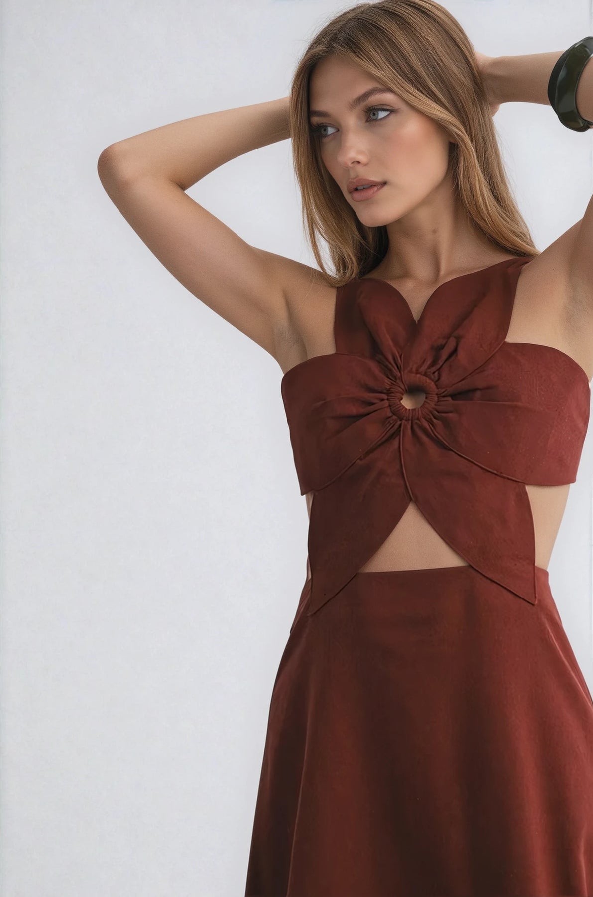 • Statement midi dress with floral-inspired bodice and ring cutout detail