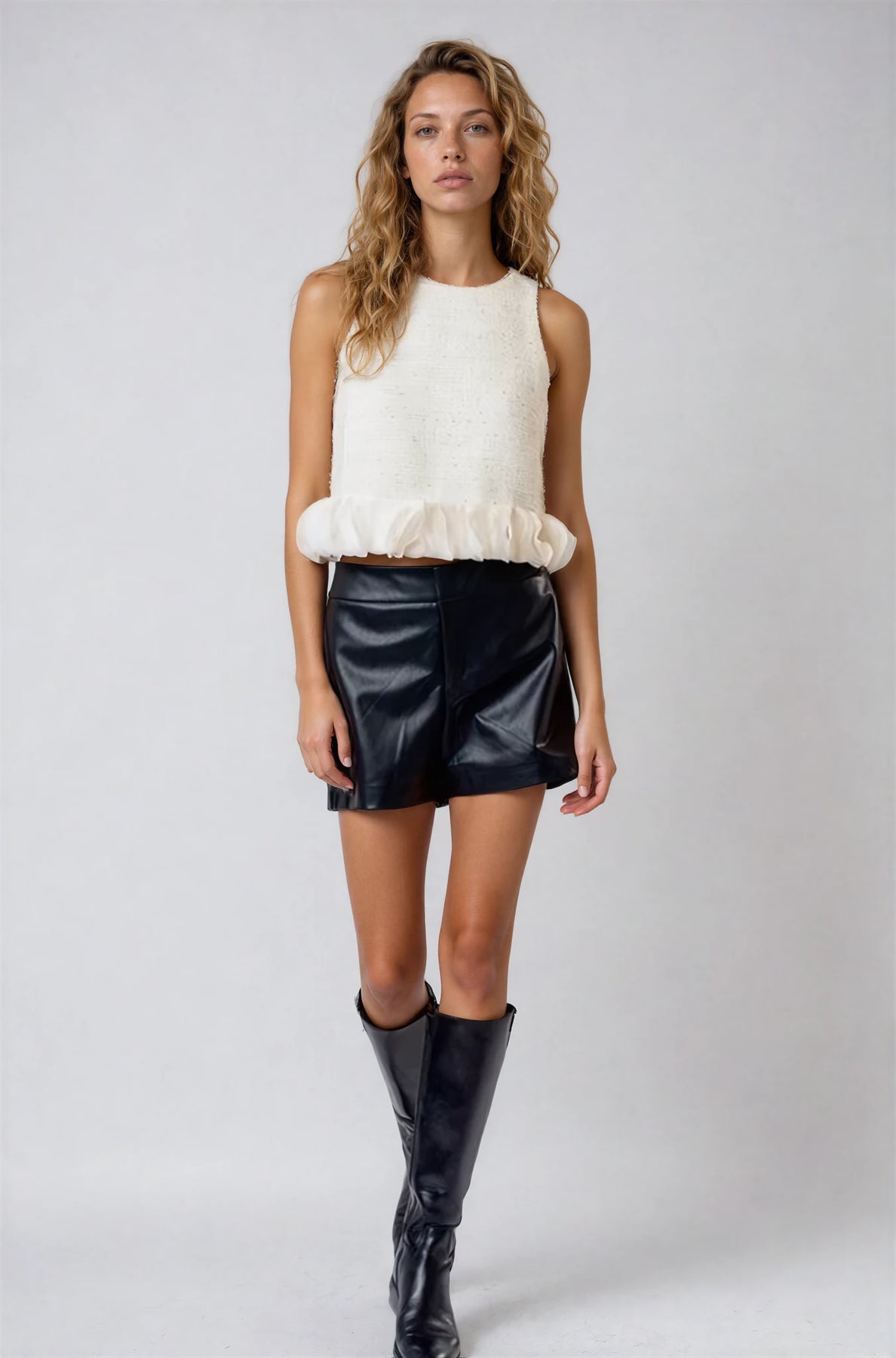 • Chic sleeveless swing top with a structured, tweed finish