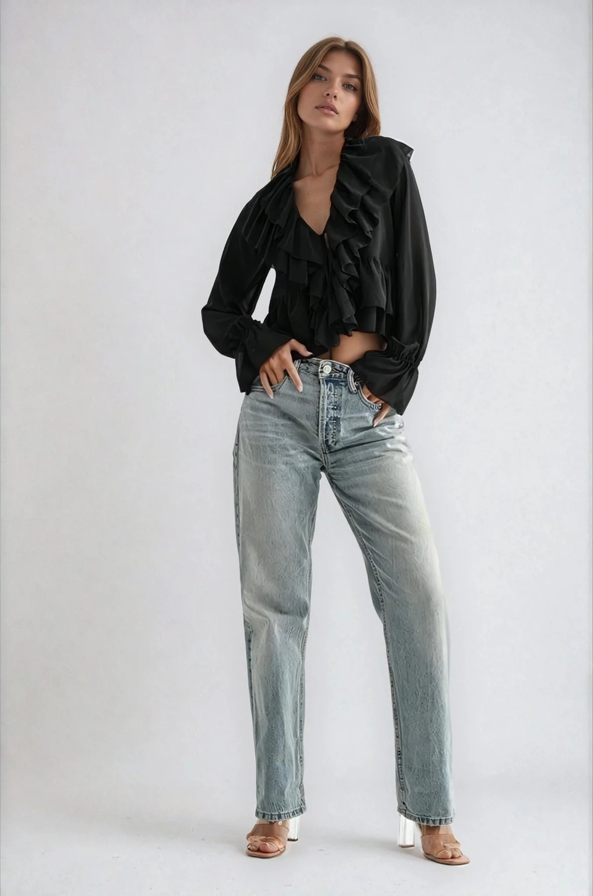 • Romantic blouse with cascading layered ruffles along the neckline and bodice