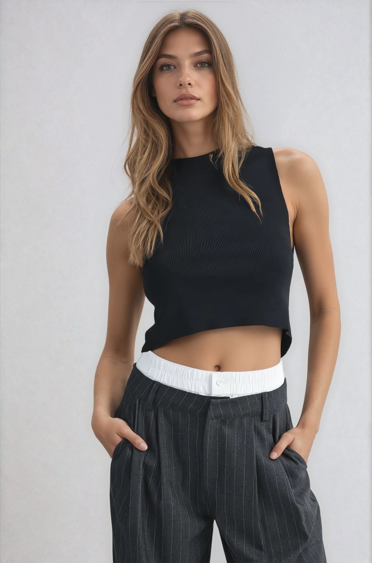• Sleek sleeveless crop top with a clean, modern silhouette