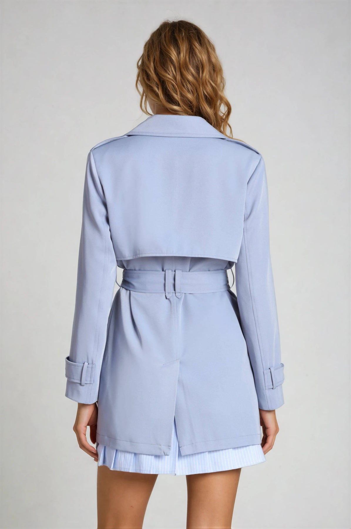 Light blue trench coat worn by a person on a plain background