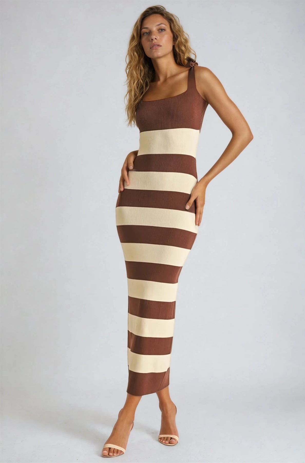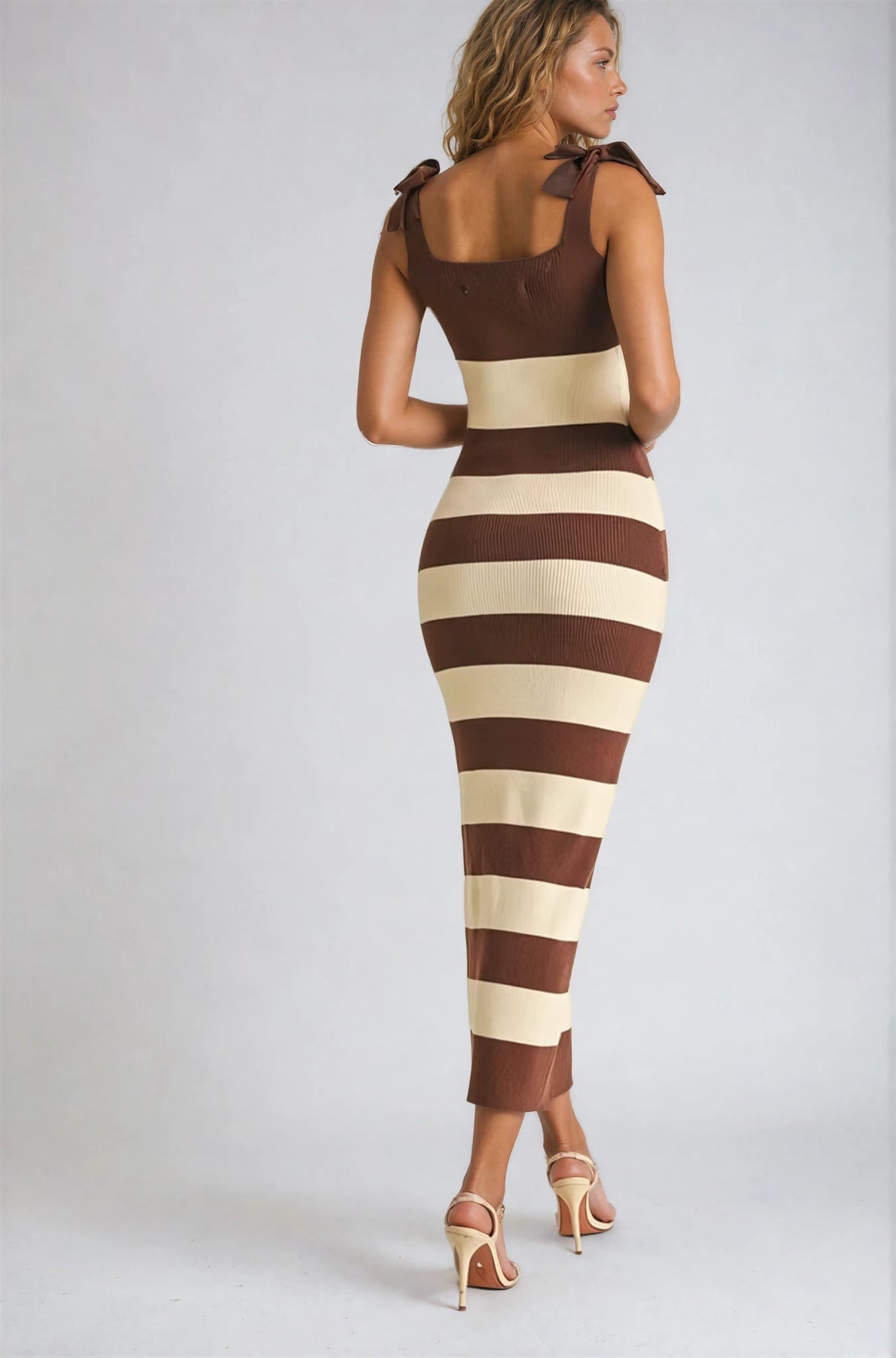 Ribbed knit midi dress with bold horizontal stripe pattern