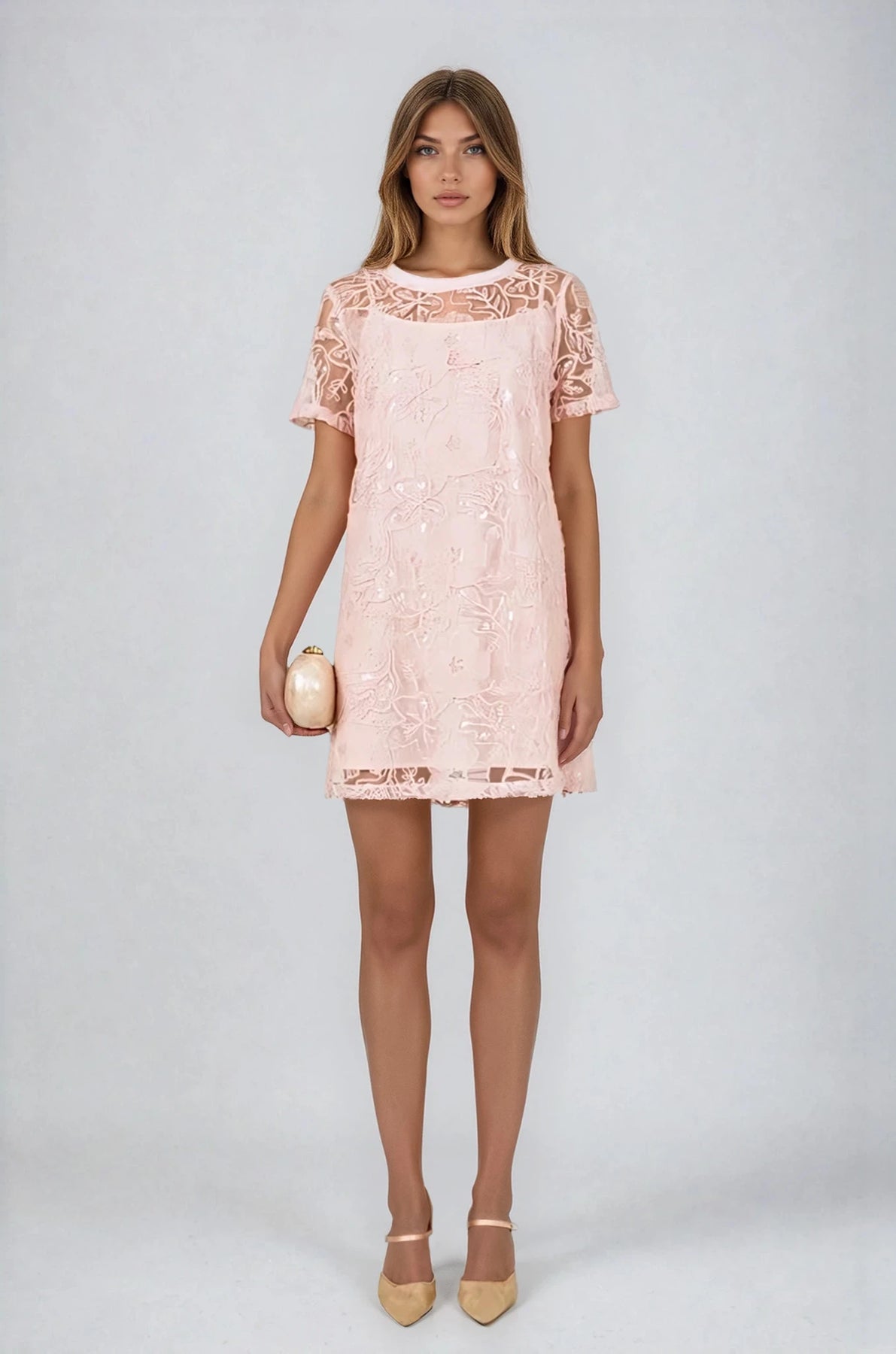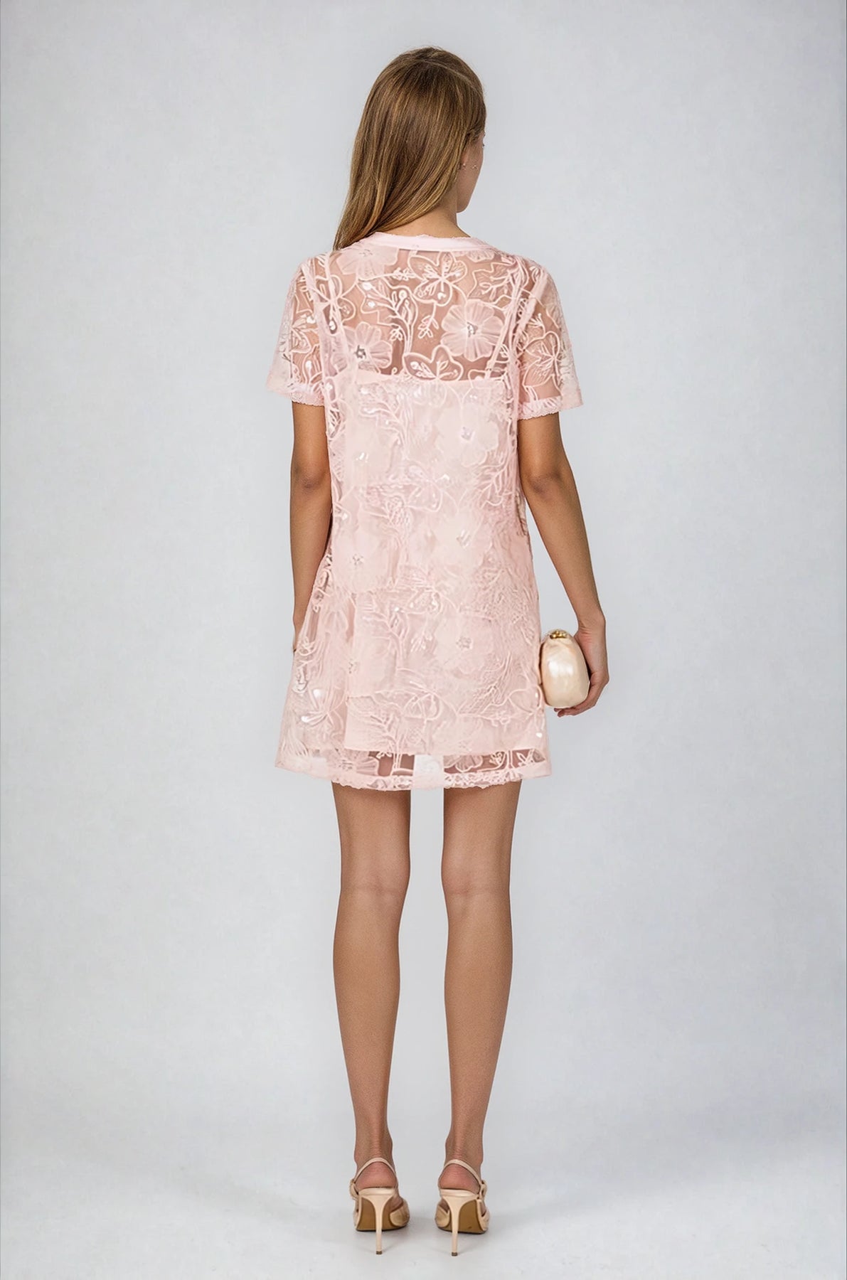 • Mini dress with delicate floral sequin embroidery throughout
