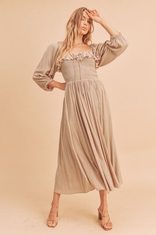 Geri is designed in a forever flattering silhouette with tied ruffled neckline, smocked bodice, lined skirt, and volume sleeves.